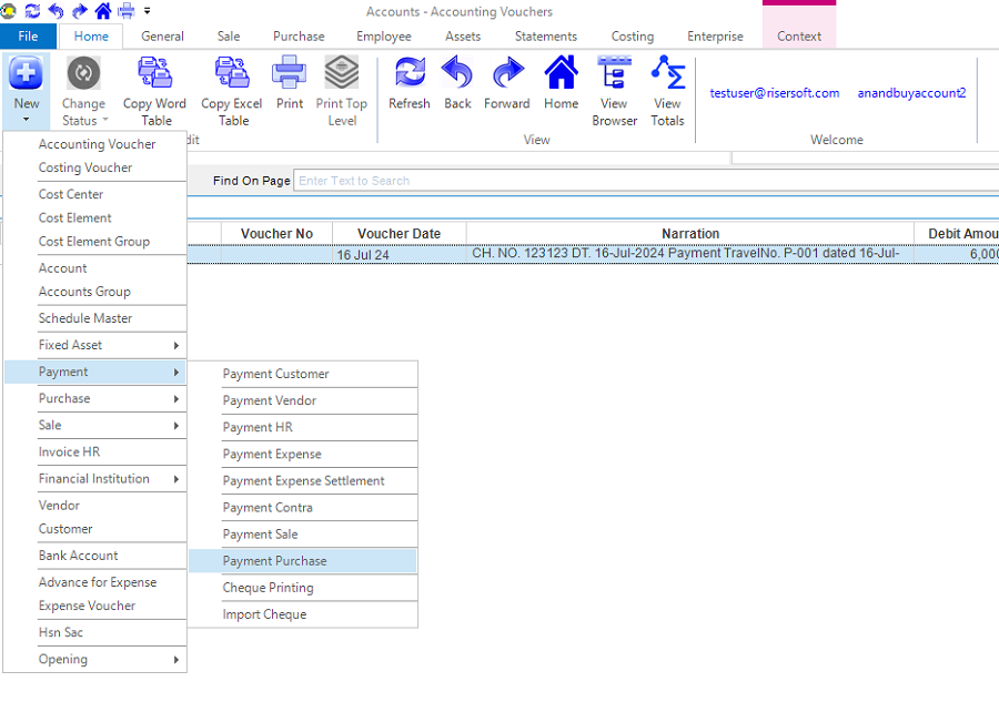 STEP-1: Click on Home -> New-> Payment-> Payment Purchase. Payment Purchase form will appear.