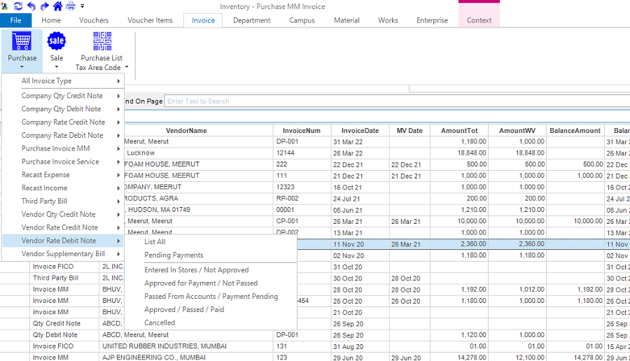 Click on Invoice -> Purchase->Company Rate Debit Note/Vendor Rate Debit Note. Company Rate Debit Note/Vendor Rate Debit Note list will appear.
