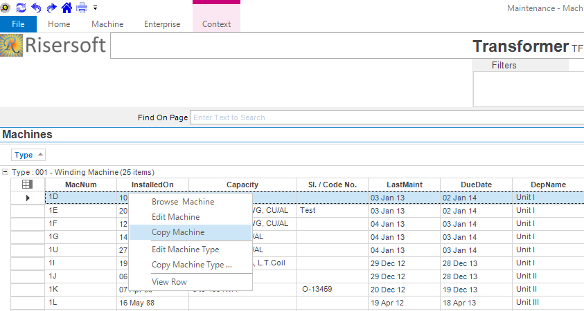 Click on Machine-> Machines->Right Click-->Copy Machine. Machine form will appear .