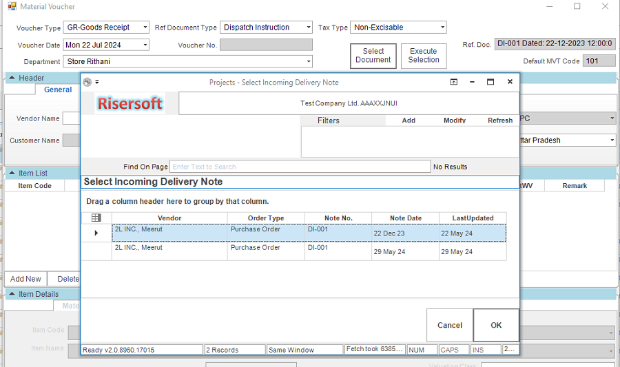 STEP-1: Select Voucher Type (Goods Receipt), Ref Document Type (Dispatch Instruction), Tax Type and Department.