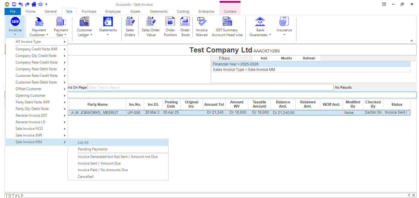 We can change Sale invoice status by clicking on Go to->Account app->Sale->Invoices->Sale Invoice MM->List All->Right Click -> Change Invoice Status.
