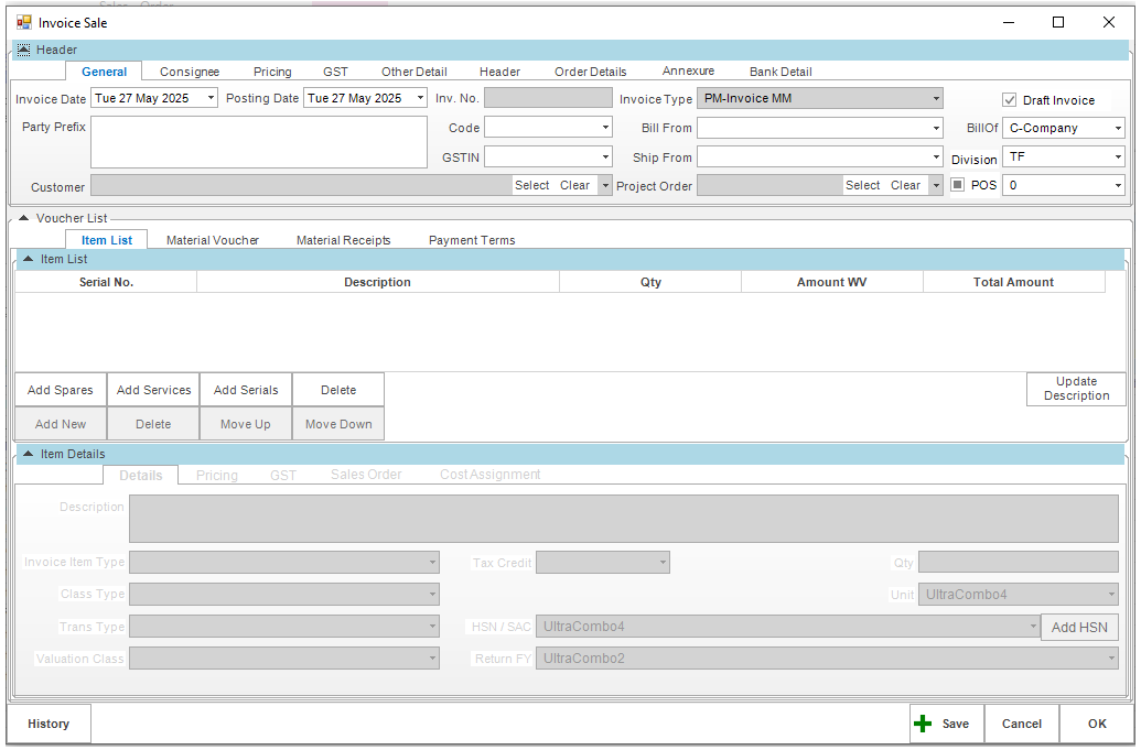Sale Invoice form opens like this, fill the details and save it.