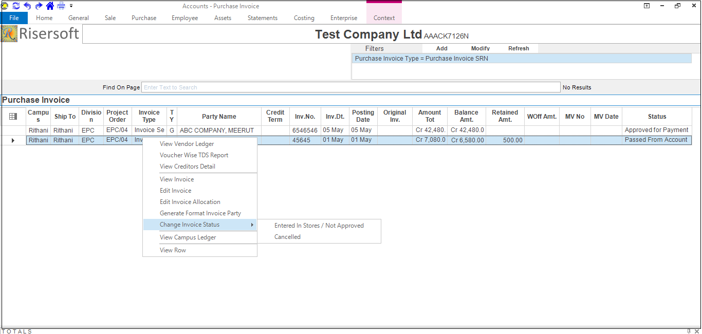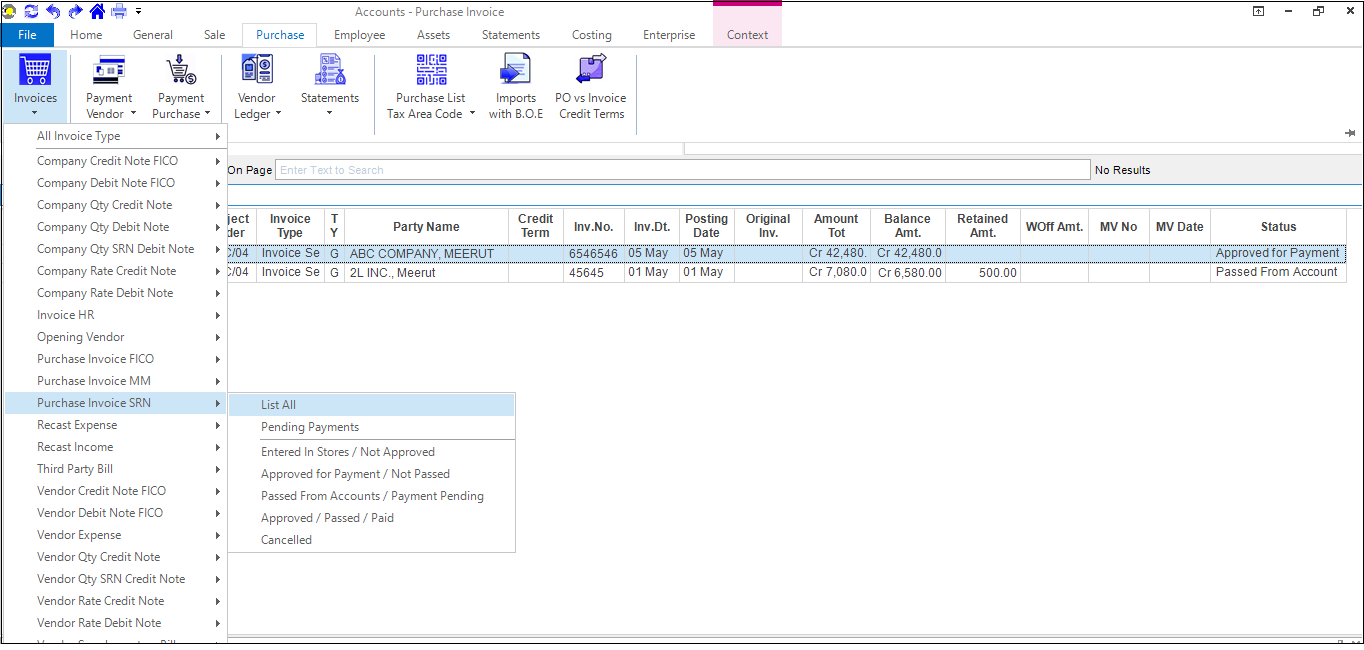 Approval for Purchase Invoice Service: We can change service invoice status by clicking on Go to -> Account app -> Purchase -> Invoices-> Purchase Invoice SRN -> List All -> Right Click -> Change Invoice Status